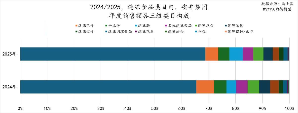 安井集团在2025年同比2024年的销售额三级类目构成变化与速冻食品下各三级类目的占比变化趋势较为一致。具体而言,类目构成仍以火锅食材为主,在集团内的销售额占比超过60%,相较2024年占比更高;同时,其速冻馄饨、速冻馒头等传统速冻类目的占比出现明显下降,速冻肠、手抓饼、速冻调理食品等类目的占比则显著上升,这或许也是安井集团顺应速冻食品市场发展趋势所做出的结构性调整与变化。