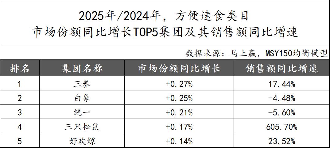 在方便速食类目中,2025年市场份额同比增长TOP 5的集团分别为三养、白象、统一、三只松鼠和好欢螺。其中,三养市场份额同比增长达0.27%,其销售额同比增速也超过15%,继续维持快速增长的态势;排名第二第三的白象、统一,其市场份额同比增长虽然为正,但受限于方便速食类目整体的颓势,两个集团的销售额同比增速均为-5%左右,份额上有增加但规模上却承压;排名第四的三只松鼠值得关注,作为休闲零食领域的领头羊,三只松鼠在近两年一直在进行多元化经营,其在方便速食类目中的布局也一年有余,取得了一定的进展。