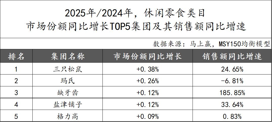 从市场份额同比增长TOP集团来看,休闲零食类目的TOP 5集团由三只松鼠、玛氏、缺牙齿、盐津铺子和格力高构成。其中,三只松鼠市场份额同比增长最高,达到0.38%;玛氏虽然市场份额同比增长为正,但销售额同比增速为负,受累于休闲零食类目在传统线下零售渠道中整体的表现情况影响;缺牙齿销售额同比增速最高,达到185.85%;盐津铺子集团则凭借魔芋零食类产品的快速增长,实现了市场份额和销售额同比的双增长。