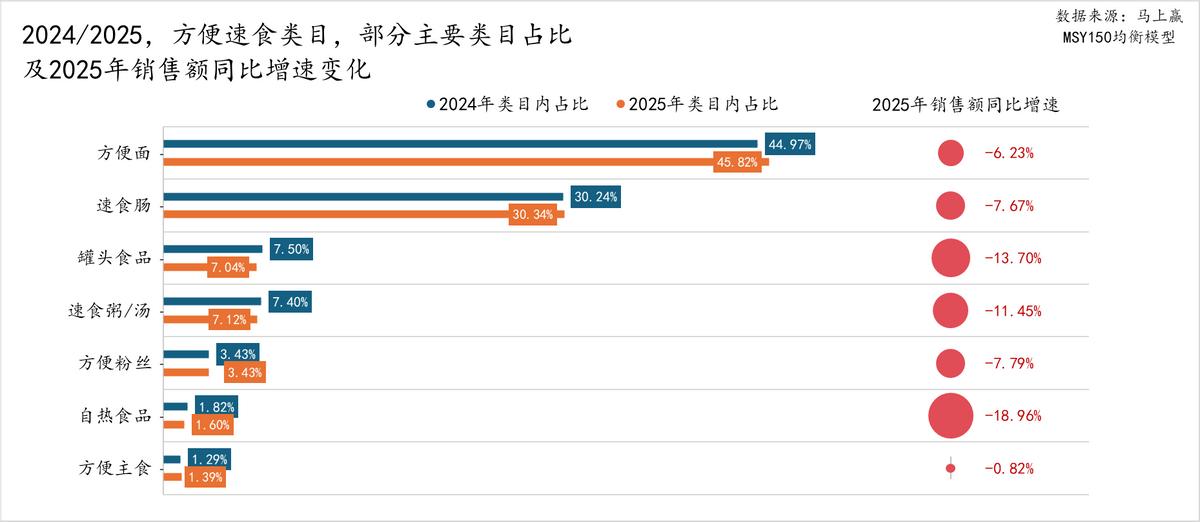 具体到不同三级类目来看:方便面仍为方便速食内占比第一的类目,且其占比在2025年还有进一步提升,但由于类目整体承压,其销售额同比增速为-6.23%;速食肠占比略有提升,但销售额同比负增长为-7.67%;方便主食类目虽然占比较小但有轻微提升,其销售额同比增速下降小于1%,好于方便速食类目中的大多数其他类目。