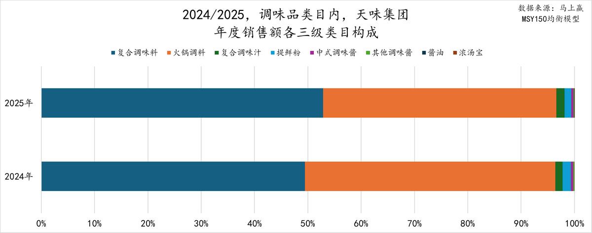 天味则主要在复合调味料、火锅调料类目经营,两个类目相加的销售额占比超过了95%。但从2024、2025两年的结构性变化看,复合调味料的占比在提高,火锅调料的占比则在降低。相比火锅调料来说,复合调味料的应用场景更多,更灵活更广泛,也符合集团多类目经营及增长的需求。