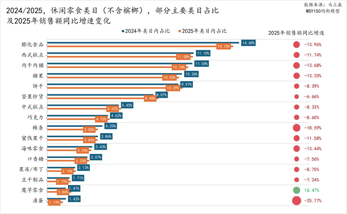 休闲零食类目构成的三级类目整体较为复杂,在选取的部分类目中,大多数类目的销售额同比增速均为负,且部分类目的负增长较为显著,如卤蛋类目跌幅高达-25.77%,辣条也达到-18.95%,为类目中压力较大的子类。从占比来看,饼干、坚果炒货、中式糕点、巧克力、口香糖、果冻/布丁、豆干制品类目内占比有所提升。唯一实现销售额同比增长的是魔芋零食类目,其2025年销售额同比增速高达16.47%,在去年的最后一篇文章中,马上赢也曾专题研究过这个类目(数读「魔芋零食」:增速领跑休食,卫龙盐津铺子“激战正酣”)。