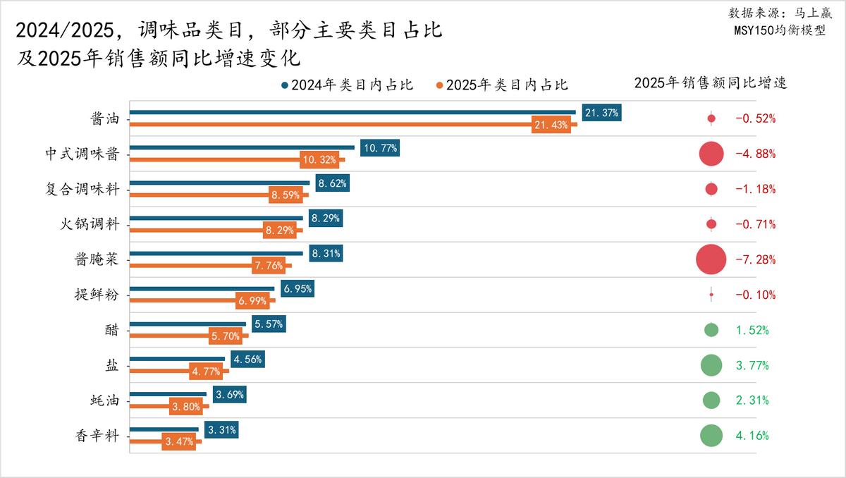 从具体类目看,速冻食品、调味品和乳制品的销售额同比增速在2025年有着较积极的变化,其中,速冻食品从2024年的负增长到2025年的正增长,且同比增速接近2%;调味品、乳制品的销售额同比增速下滑都有着较为显著的收窄,其中调味品已经基本回零,乳制品的销售额同比增速下滑也收窄近半。