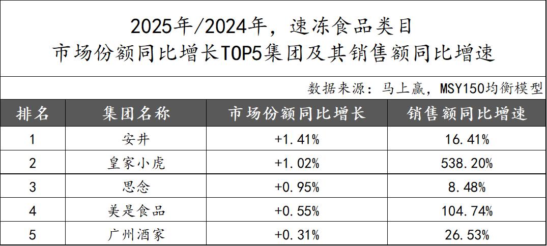 在增长集团部分,同样基于调味品、速冻食品、方便速食、乳制品、休闲零食(不含槟榔)五大类,我们以2025年集团市场份额同比2024年集团市场份额的增长绝对值进行降序排列,取各大类中绝对值增长前五名的集团列为类目增长TOP5集团,并提供了这些集团在该大类内在2025年的销售额同比增速。针对部分较有特色、代表性的集团,马上赢还分析了2024、2025年或2025年单年,这些集团在大类中的三级类目销售额构成及变化。
