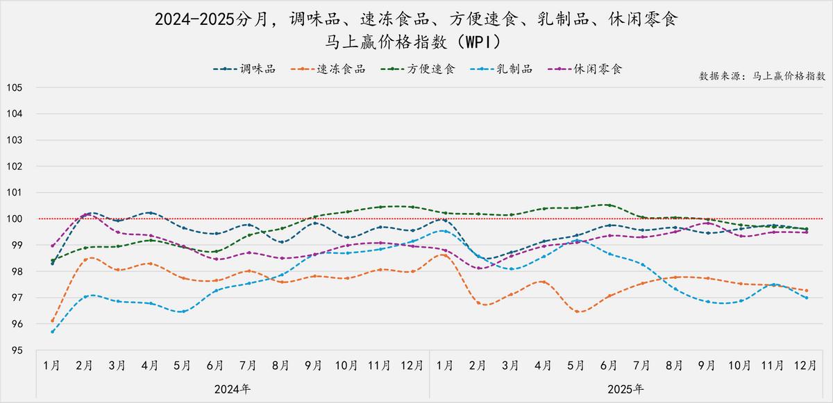 在过去两年几个类目的马上赢价格指数表现上,最显著的共性是除了方便速食在2024年9月到2025年7月指数超过100外,其余类目排除春节错位带来的影响,绝大多数时间价格指数均低于100,这也意味着除方便速食外的其他类目,近两年都有着较为显著的价格下行压力,尤其是速冻食品、乳制品,两年全年未超过100,整体在97-98上下徘徊波动。