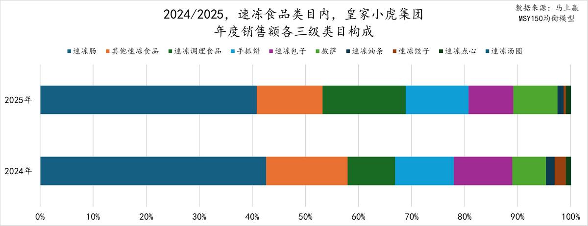 速冻肠在速冻食品类目中的占比以及销售额同比增速均迅猛增长,但类目的增长速度并没有赶上皇家小虎的增长速度,皇家小虎的销售额同比增速更快,这也就造成了一个独特的现象:在各家集团的速冻肠类目占比都在增长的2025年,以速冻肠为核心的皇家小虎,速冻肠在集团销售额三级类目构成中的占比反而在下降。
