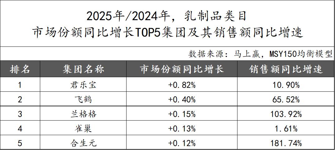乳制品类目市场份额同比增长TOP 5由君乐宝、飞鹤、兰格格、雀巢和合生元构成。其中,君乐宝市场份额同比增长高达0.82%,领先于其他集团,其销售额同比增速也超过10%;飞鹤、兰格格、合生元三个集团在乳制品类目中的销售额同比增速较高,分别为65%、103%、181%,在乳制品类目整体承压的背景下,规模增长显著。