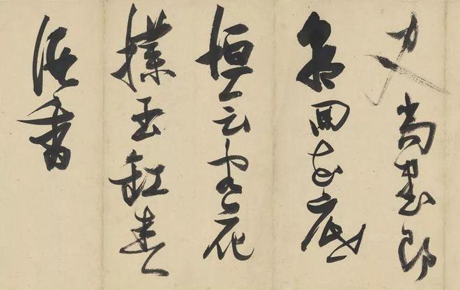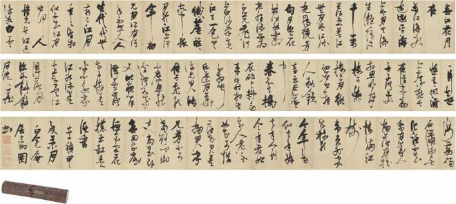 他在本卷中体现出了对作品节奏超强的把控能力。手卷不总是能全部展开赏玩,在今天,现代摄影技术能轻易看到作品整体,我们会惊叹于本卷在节奏上宛若天成。张瑞图的作品在临仿起来难度颇大,首先是其行笔速度快,他的字形特征明显,即使点画和结构可以略肖一二,但鉴于作品整体的节奏、章法及酣畅的气势,只要稍有犹豫,就会对某一方面照顾不周。笔势的流动连贯、结字的虚实和习惯的用墨量,其中微妙的变化,都不是临仿者能轻易达到的,让人不得不感叹其位列晚明四家非虚。