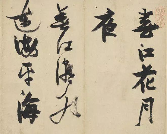 再看内容,《春江花月夜》无需赘述,是一首景、理、情交融的杰作。还有岑参的《韦员外家花树歌》,当读到“朝回花底恒会客,花扑玉缸春酒香”时,不禁让人会心一笑。张瑞图嗜酒如命,在大夫建议他不要过饮时,他依旧每日饮酒,但此时的他的心态早已与从政时截然二致,在书写完《春江花月夜》这首长诗时,他也许并未尽兴,喜不自胜之时,怎可少美酒相伴?此时应该不需为了章法还是创作本身去刻意再加一首,想必这也是张瑞图最开心快意时的作品了。好诗好字好时节,通篇洋溢着的美好氛围,仿佛让观者也闻到了花香酒香。