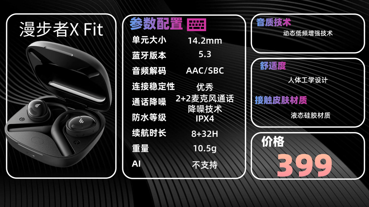 推荐理由:漫步者 X Fit 在四百元价位做到了四麦通话降噪、游戏低延迟等实用功能,佩戴兼容眼镜用户,满足用户日常听感和使用需求