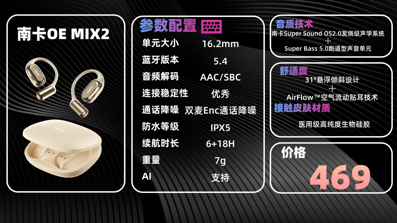 这款南卡OE Mix 2配备了最先进的蓝牙5.4芯片SOC,性能进一步提升通讯效率与抗干扰性,达到秒连、秒响应,SOC,享受到更快的数据传输速度和更稳定的连接。延迟更低,始终做到音画同步。而且通话清晰度也是非常高的,在双麦智能通话降噪的加持下,能够更好地消除通话时多频段的环境噪音,让通话始终保持清晰自如。另外还拥有IPX5级防水、24H全天续航、十余项AI能力等功能,使得南卡OE Mix2性价比远超同类竞品,甚至可以媲美千元旗舰机型,是今年当之无愧的百元最佳开放式耳机性价比之选。