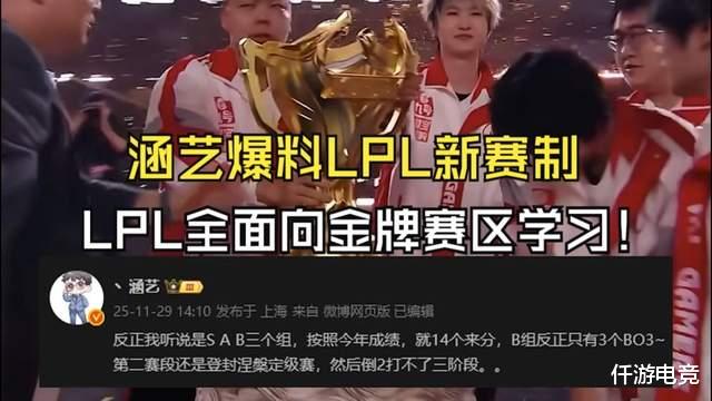 LPL知名爆料人涵艺在个人社交平台上透露:明年S16赛季,LPL将使用新赛制,分成S、A、B三个组。并且第二赛段还是登峰和涅槃的定级赛,然后倒2打不了第三赛段。