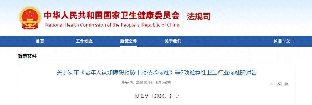 国家卫生健康委发布《老年人认知障碍预防干预技术标准》等7项推荐性卫生行业标准,编号和名称如下