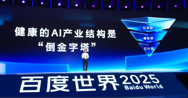 李彦宏在今年的百度世界大会上提到一个“倒金字塔理论”:“过去,AI产业结构像一个正金字塔,最底层的芯片拿到了绝大部分的价值;芯片之上的模型,赚到的钱可能不到芯片的1/10;模型之上的AI应用,又小了一个数量级。这个产业结构是非常不健康的,是不可持续的,因为芯片并不直接产生价值,应用才能够产生价值。”