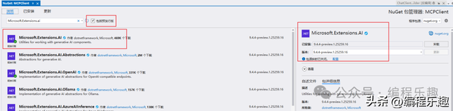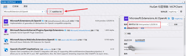 添加依赖库:Microsoft.Extensions.AI.OpenAI,版本为:最新预发行版 9.4.4-preview.1.25259.16,添加的时候记得勾选:包括预发行版。