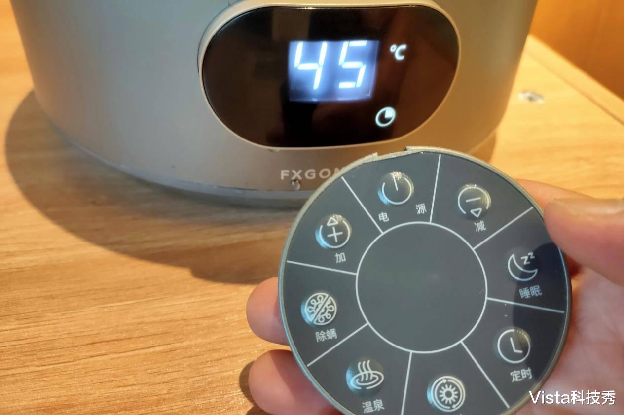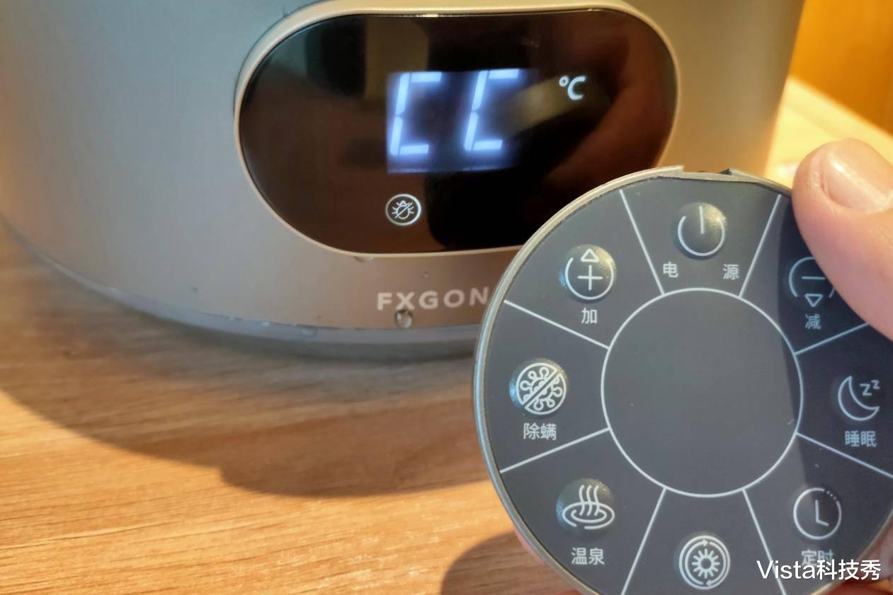 除了主机上的按键外,宫菱水暖毯还配备了遥控器,圆形小巧的遥控器可以刚好契合在主机的圆形凹槽处,非常巧妙的设计以免到处找遥控器,遥控器上列出了电源、加温、减温、除螨、温泉、烘被、定时、睡眠等功能,功能模式一目了然,操控简便,遥控器可在2米远距离操控,躺在床上无需起身就可以实现一键控制。