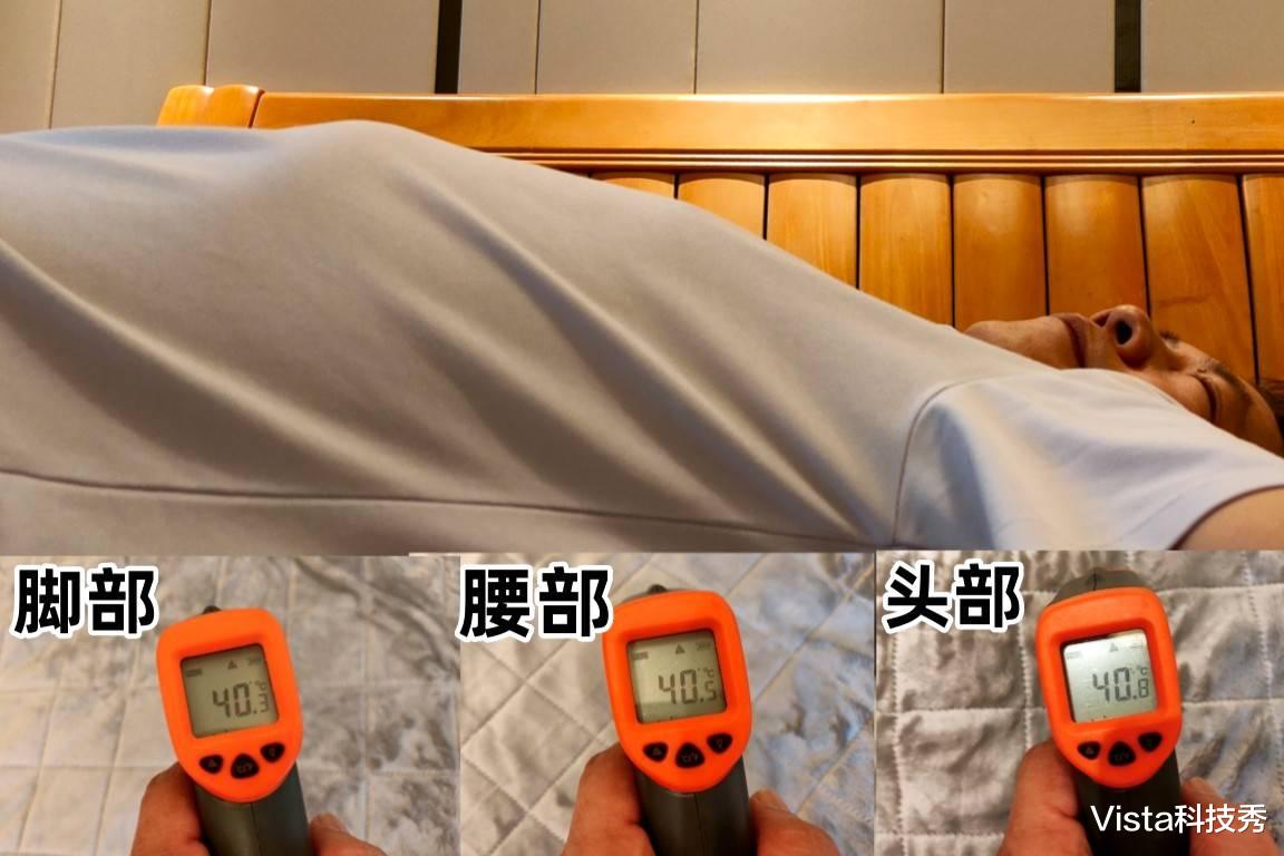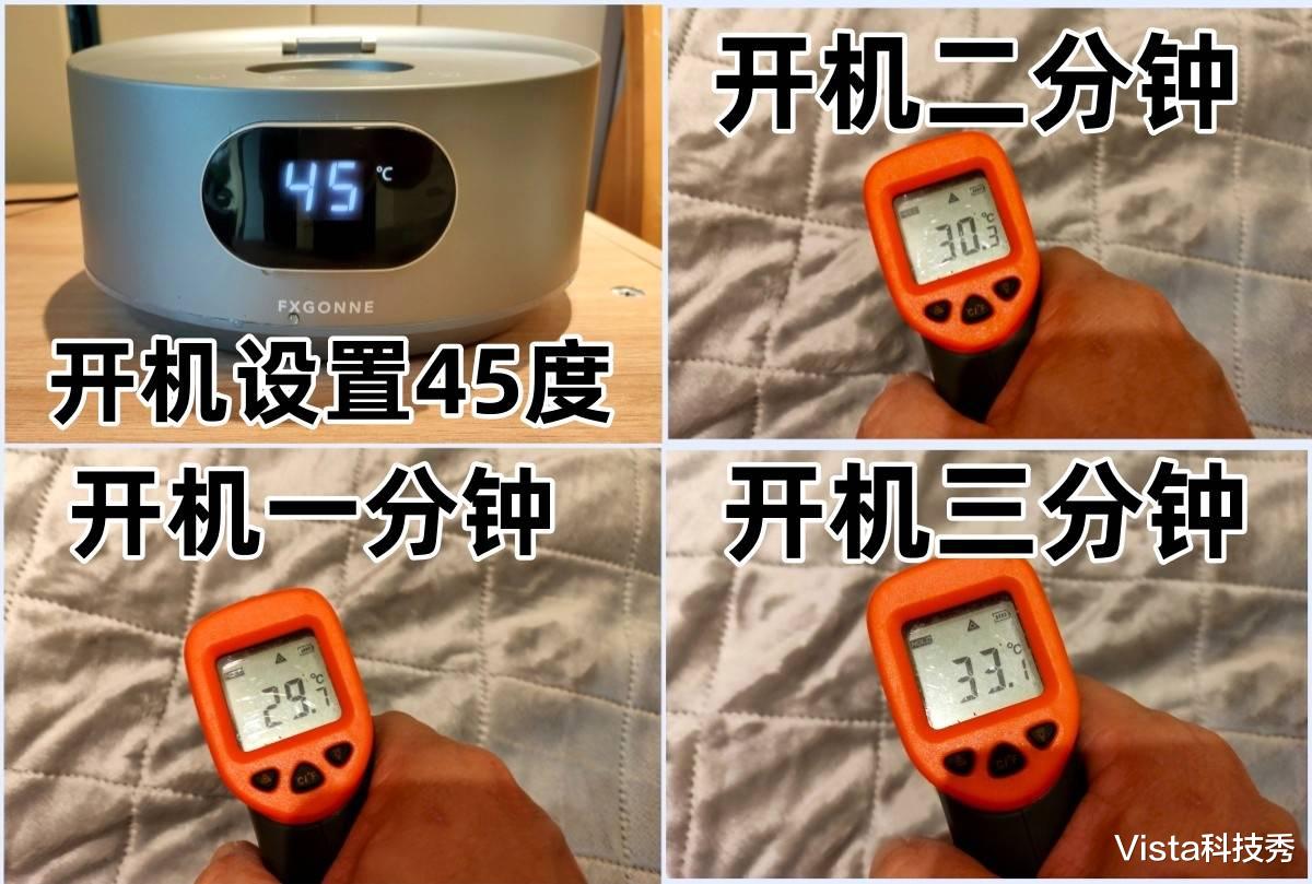 冬天最怕的是脱完衣服进被窝的那一刻,冰冷的被窝要靠自身的热量缓慢热起来,以前使用的水暖毯起码要等半小时后才有点热度,开机实测宫菱水暖毯,温度设置45℃,一分钟后测温仪测温,毯子升温速度很快,两分钟就到了30℃以上,仅3分钟即可将床面整体加热到33℃以上,持续到5分钟升温可达37.6℃,升温速度快得益于宫菱水暖毯加厚高纯度PTC陶瓷体加热和蜂窝式直流无刷水泵,以及全封闭一体化设计,加热过程中几乎没有能量损耗,能够快速升高温度并启动锁温机制,并且热量分布非常均匀,无论躺在毯子的哪个位置,都能感受到舒适的温暖。