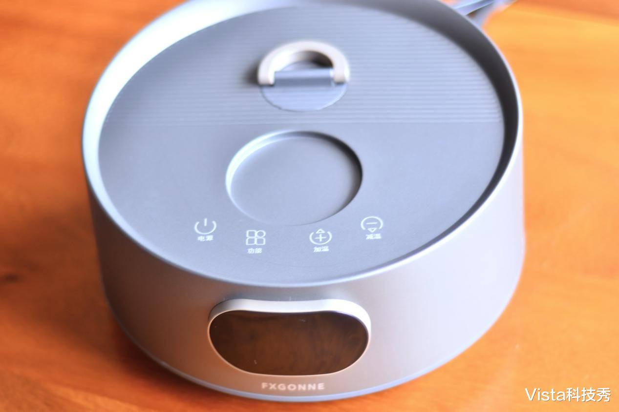 宫菱水暖毯主机银灰色圆形设计,正面有四个按键,分别为电源、功能、加温、减温控制键,上方有圆环位置为加水口。