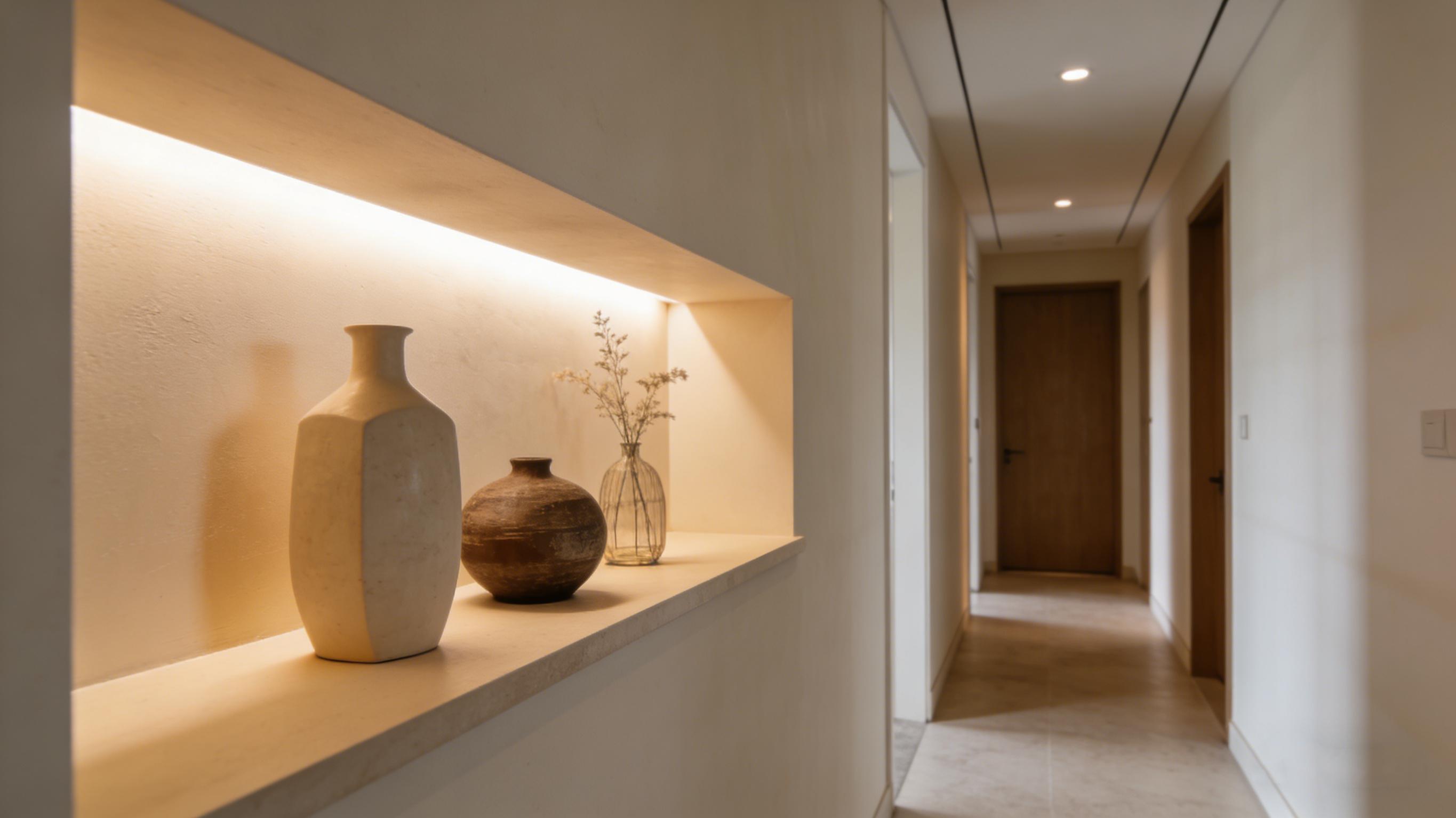如果家里过道有新砌墙,也可以考虑装壁龛,主要用来摆放装饰品,增加空间的艺术感——里面摆上精心挑选的摆件、纪念品、书籍或绿植,再搭配内置的灯光,晚上开灯后,光影效果特别温馨,让过道不再是单纯的“通道”,反而成了家里的一个小亮点。