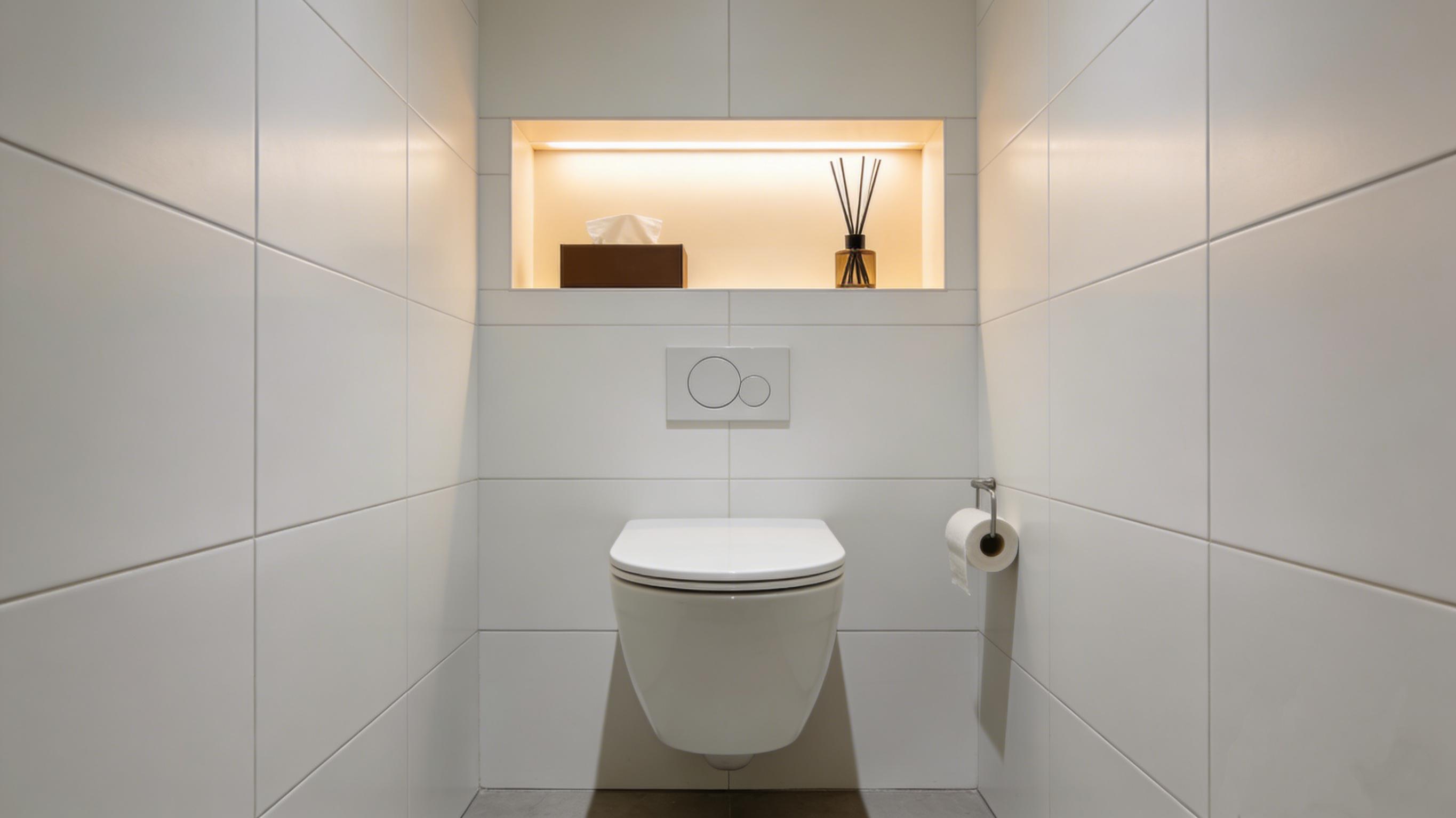 现在很多家庭装修会选择壁挂马桶,壁挂马桶安装时需要在后方砌墙,把安装支架和管道包裹起来,这个新砌的墙体的上方,就是做壁龛的绝佳位置——将马桶顶部做成壁龛,放置香薰、纸巾盒,这样马桶周边的收纳问题就优雅地解决了。