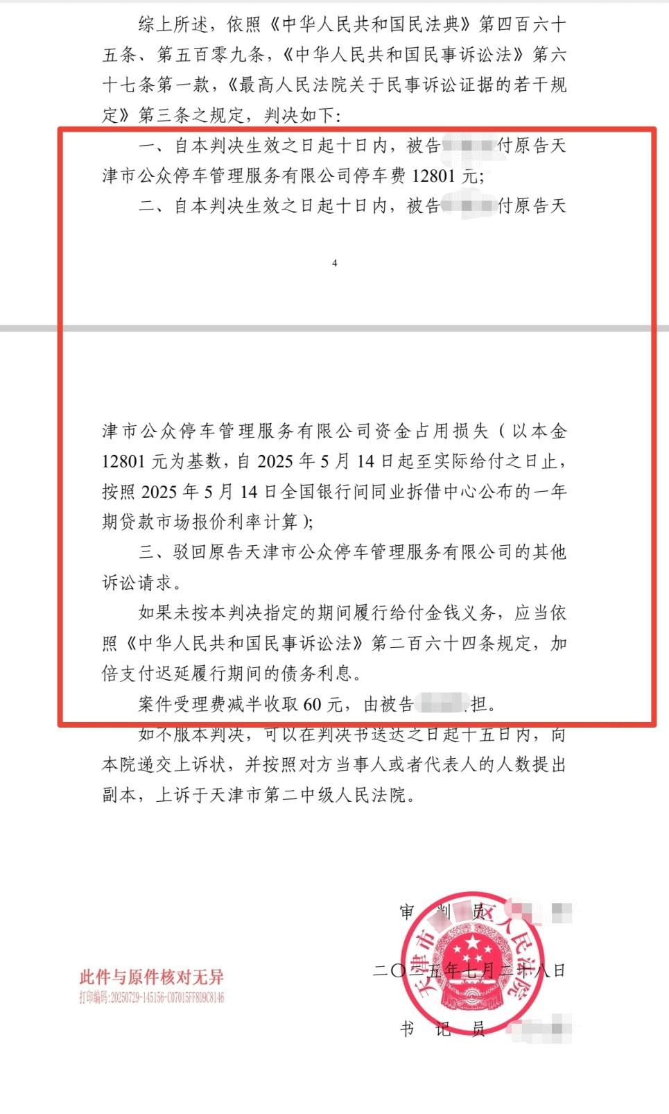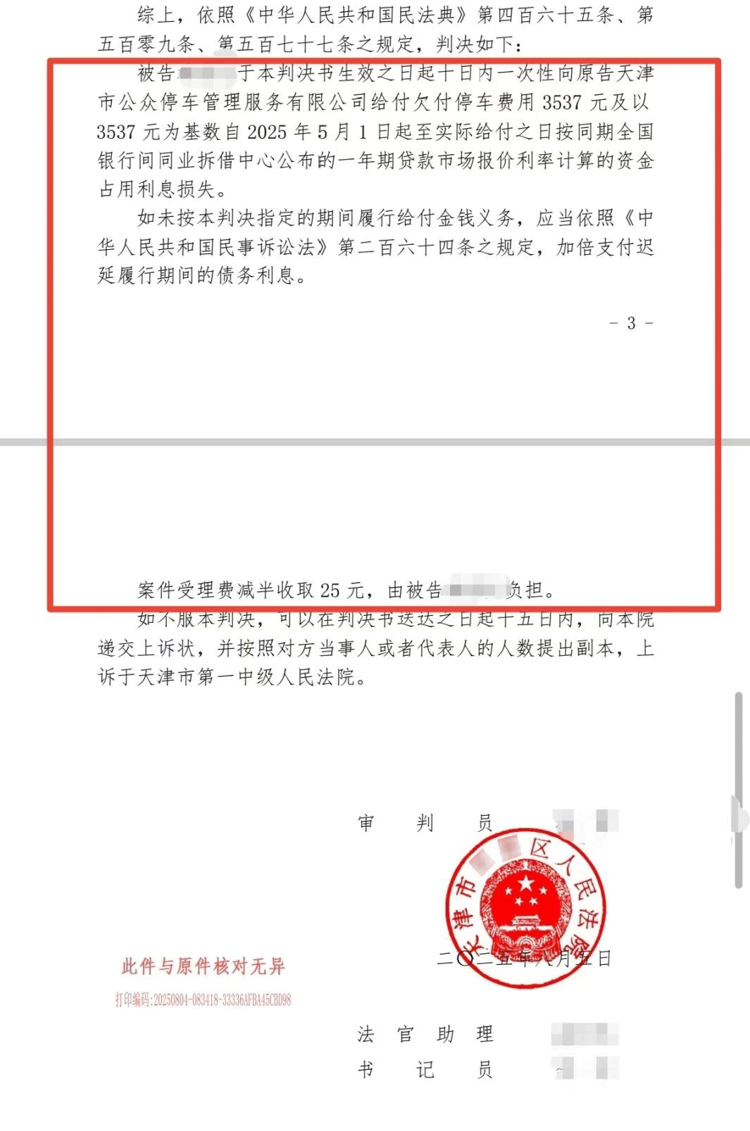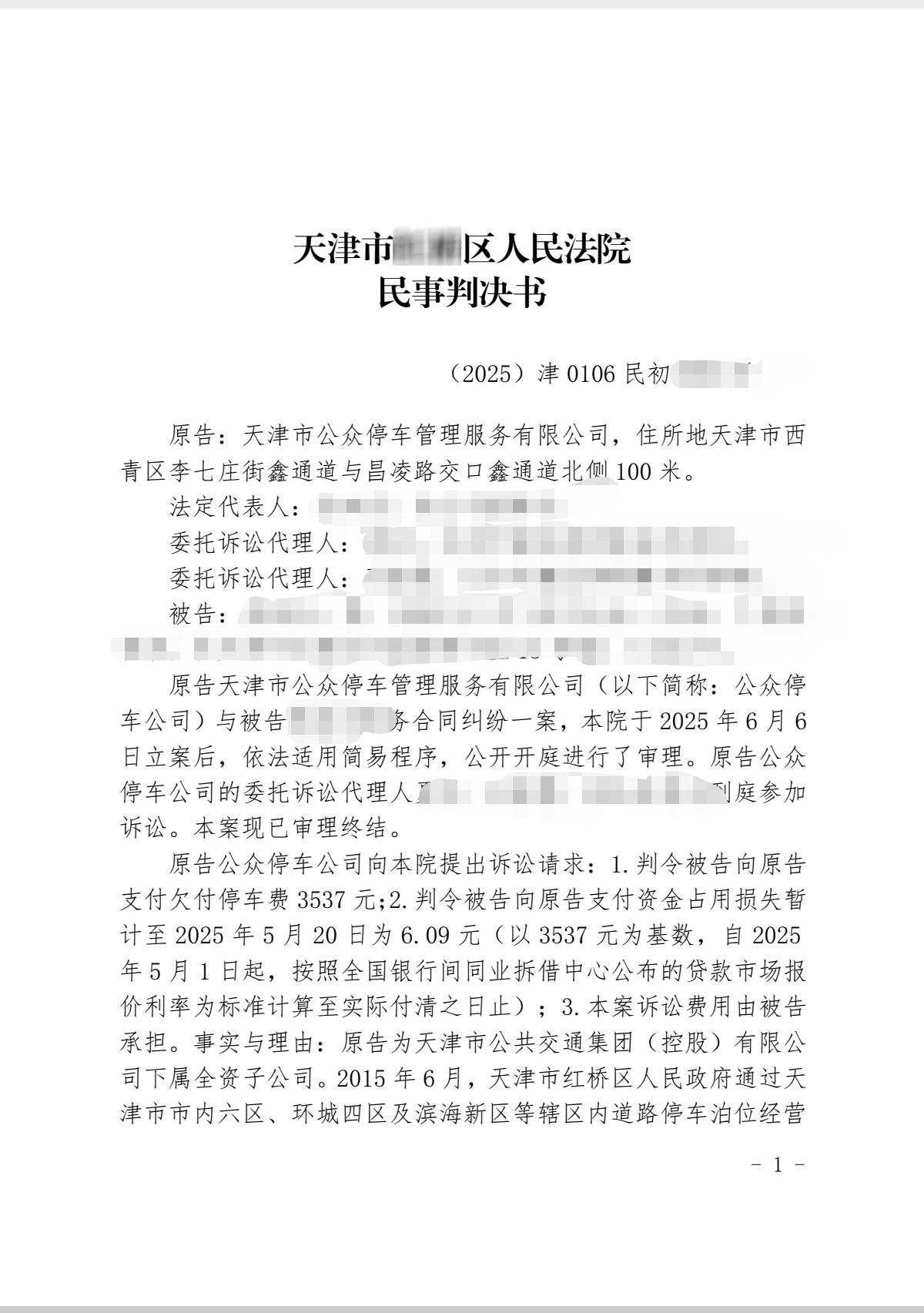 近期,天津市公众停车管理服务有限公司通过法律途径对部分长期拖欠道路停车费的车主开展维权行动。截至目前,天津市相关人民法院已经作出一审判决,判令两名欠费车主一次性全额补缴停车费用及资金占用利息损失,并承担诉讼费用。