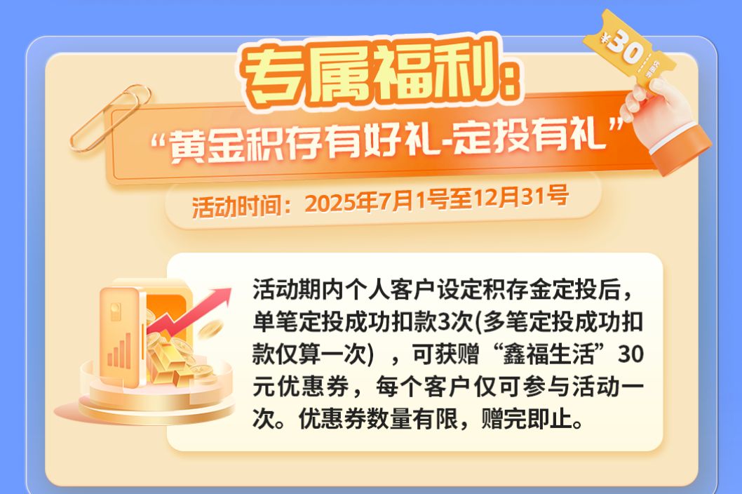 以南京银行为例,该行于2024年8月上线个人积存金业务。从线上渠道来看,其加大对黄金积存业务的推广。比如,自7月起,该行推出黄金积存定投有礼活动,定投扣款三次可获赠30元优惠券。同时,在南京银行买入积存金手续费限时优惠为0.1%。