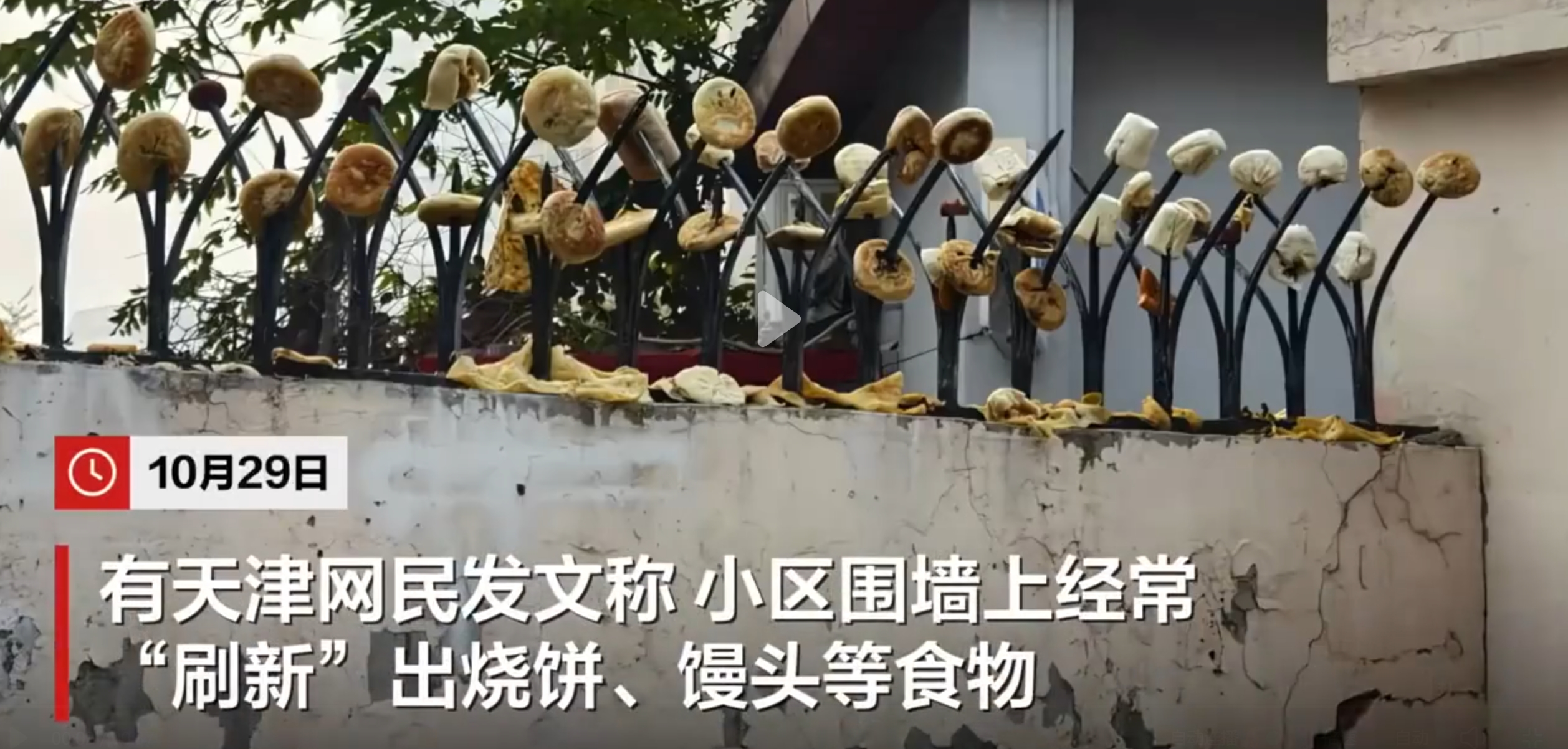 从这位网友记录的视频画面看,小区围墙的防盗刺上竟插满了烧饼和馒头等食物,这些烧饼和馒头从哪里来,要到哪里去?会不会流入到老百姓的餐桌上,引发了小区居民和网友的担心。