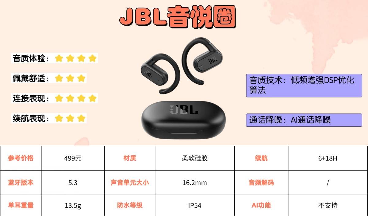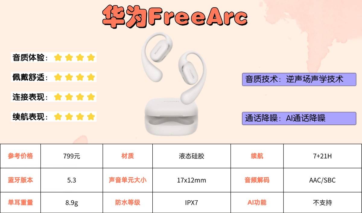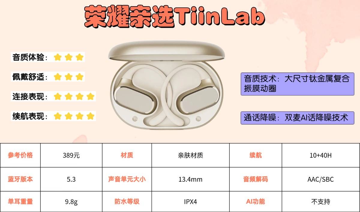 配置层面,耳机搭载蓝牙5.3芯片,连接快速稳定。定向传声技术可有效降低漏音,提升私密性;双麦克风配合AI降噪算法,保障通话清晰度。续航表现扎实,单次使用约10小时,搭配充电盒总续航接近40小时,足以覆盖全天使用需求。支持IPX4级防水,可应对日常汗液或微雨侵袭,整体功能配置均衡可靠。
