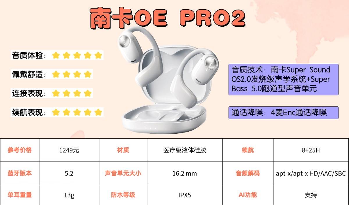 智能体验层面,OE Pro2融入南卡自研AI多模态系统,支持语音对话、实时翻译、创作辅助等多元化功能,让耳机从单纯的高音质播放设备升级为贴心的智能生活伙伴。凭借AI技术与声学实力的完美融合,这款产品收获了500+数码博主与60+科技媒体的权威推荐,被誉为开放式耳机领域的全能标杆之作。