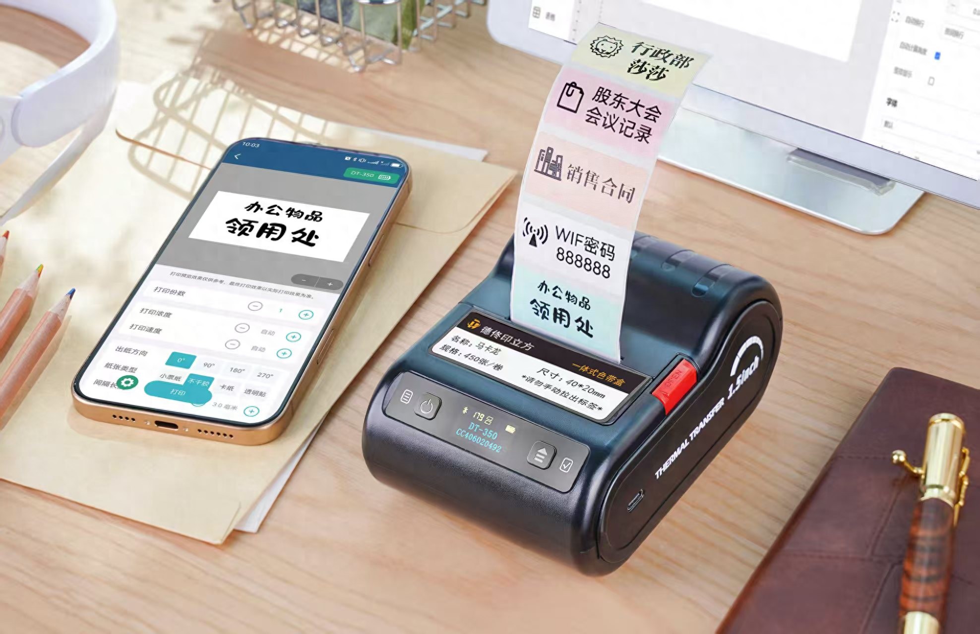 与传统标签机需要连接电脑才能使用不同,这款设备最大的亮点是彻底摆脱了线缆束缚。打开手机蓝牙,启动“微打”APP,就像连接无线耳机一样简单。市场人员布展时发现物料缺少标识,当场用手机就能打印贴好;行政人员巡查办公室时发现开关标识破损,站在梯子上就能完成重新打印。