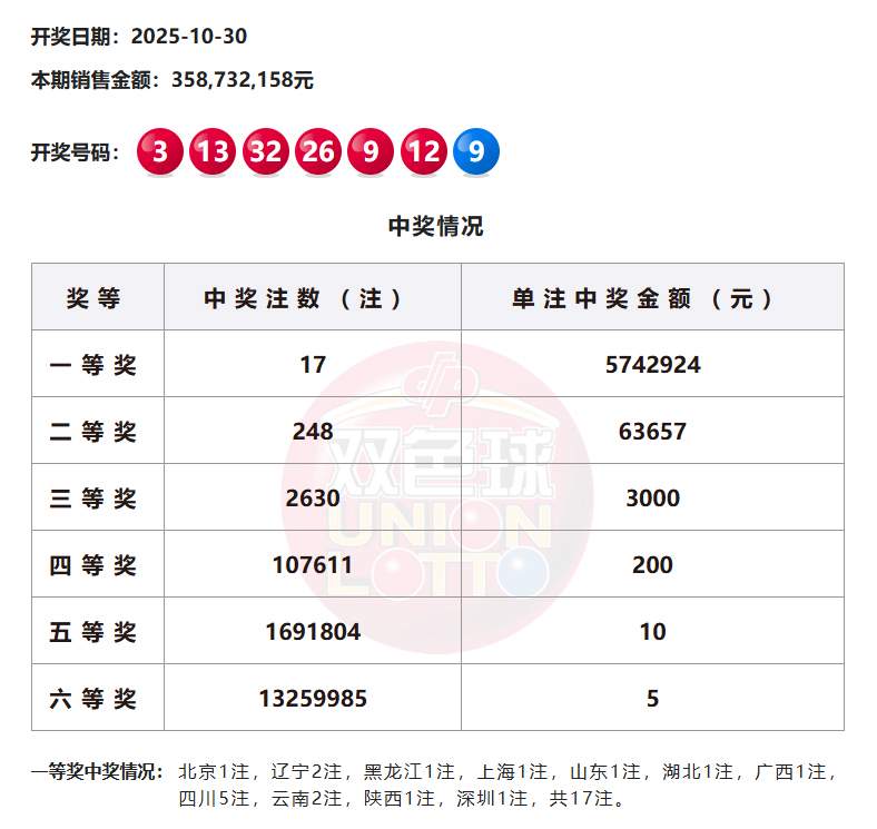一等奖中奖情况:北京1注,辽宁2注,黑龙江1注,上海1注,山东1注,湖北1注,广西1注,四川5注,云南2注,陕西1注,深圳1注,共17注。