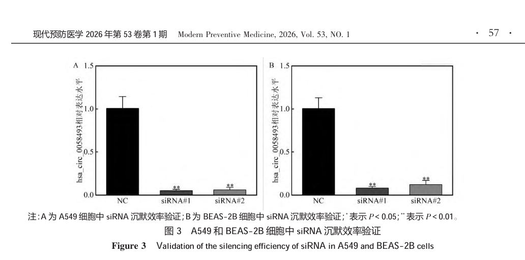 云南省公共卫生与生物安全重点实验室研究者在环状RNA hsa_circ_0058493在砷诱导肺细胞凋亡中的机制研究课题中,使用RFect siRNA转染试剂将靶向hsa_circ_0058493的siRNA分别转染到人肺腺癌细胞系A549和人支气管上皮细胞系BEAS-2B中。通过RT-qPCR检测siRNA沉默效率,结果显示转染后hsa_circ_0058493在两种细胞中的相对mRNA表达水平显著下降90%以上。