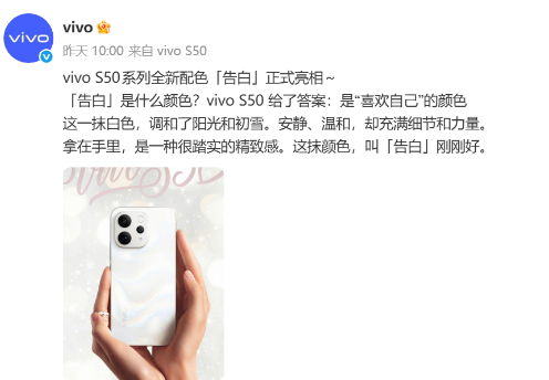 vivo高管韩伯啸不按常规地加更爆料,让S50Promini的关注度直线上升。他特意强调的“唯一的小屏横向Deco产品”,让整个系列的差异化更加突出。尤其是航空铝金属、纯平镜头模组、不凸结构的组合,让这款小屏机的“质感存在感”直接拉满。官微那条极具诗意的配色文案——全新告白色。那句“调和阳光和初雪的颜色”,瞬间把新品的温柔气质拉满。其实S系列一直很懂年轻用户的情绪需求,而这次的定位更加内核向:不仅是一个白色,而是“喜欢自己”的感觉。看似轻描淡写,却非常“击中”当下年轻用户的共鸣点。配色不仅是外观,更是一种态度。