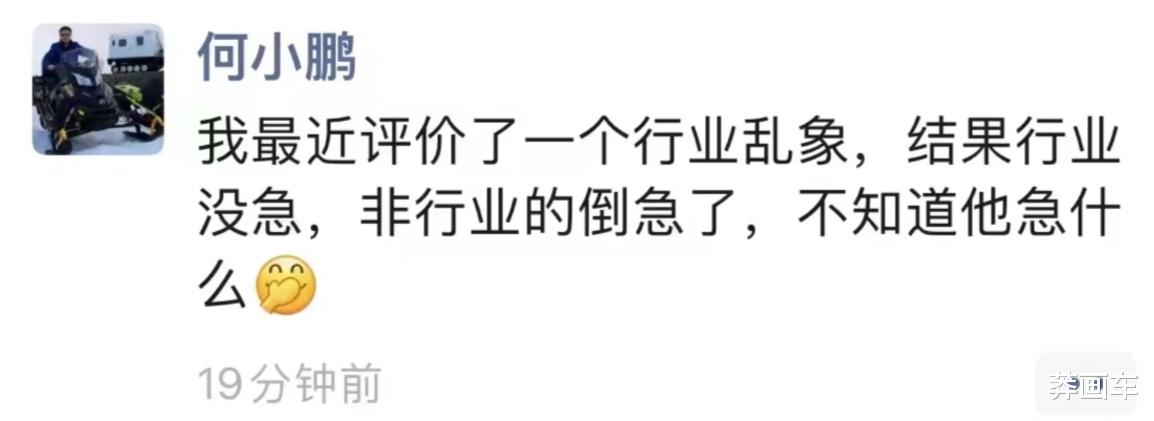 而就在 11 月 4 日晚,又曝出来一张何小鹏朋友圈的截图。何小鹏称:“我最近评价了一个行业乱象,结果行业没急,非行业的倒急了,不知道他急什么。”