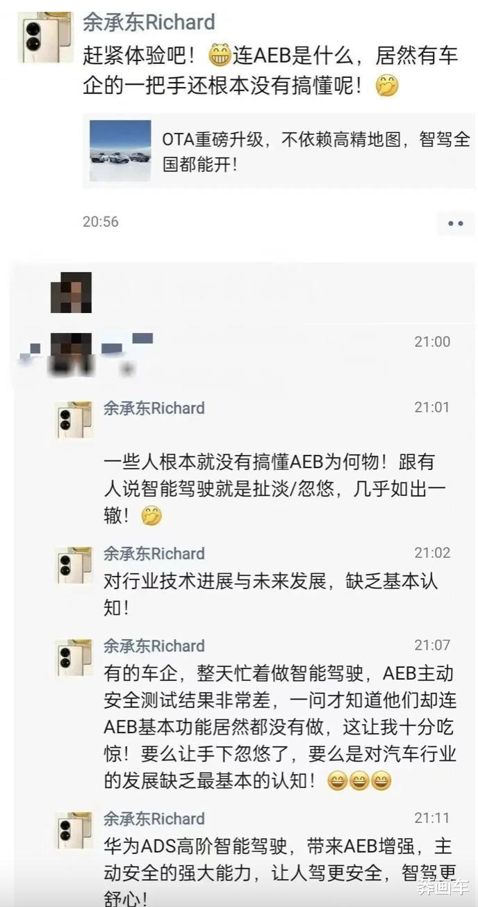 那这时候,余承东就在在朋友圈中表示,“赶紧体验吧!连 AEB 是什么,居然有车企的一把手还根本没有搞懂呢!”