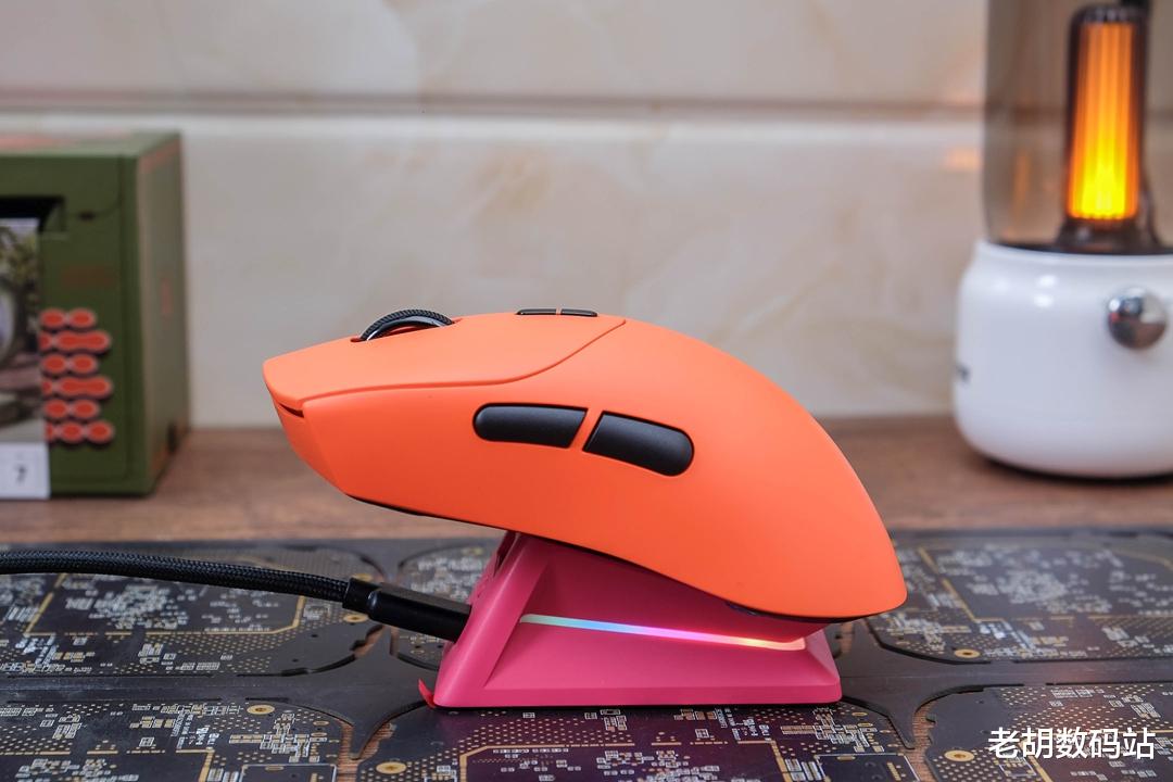 为了充电更方便,我还额外入手了雷柏P5触点充电底座,并选了树莓粉配色,搭配手上的焰影橙鼠标,视觉效果非常亮眼。充电采用磁吸触点设计,没电时随手一放就能自动吸附充电,免去了反复插拔线缆的麻烦。值得一提的是,充电时底座会亮起幻彩RGB灯光,通过按键或者A Hub生态系统可自由切换多种光效,即便摆在桌上,也是一个不错的装饰点缀。