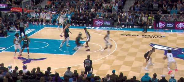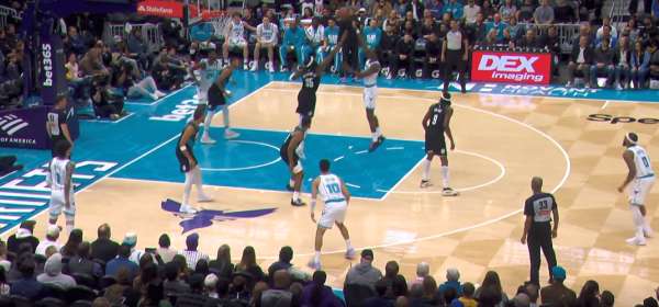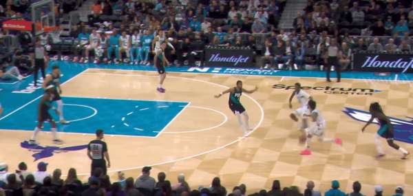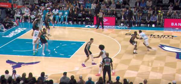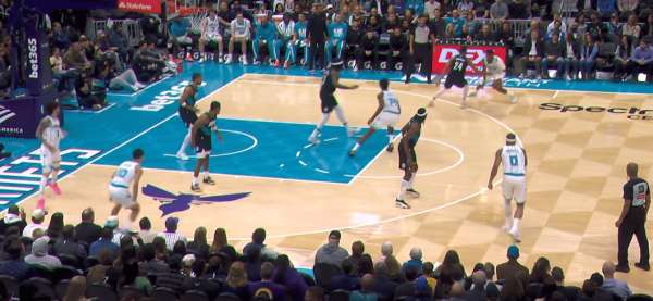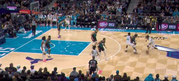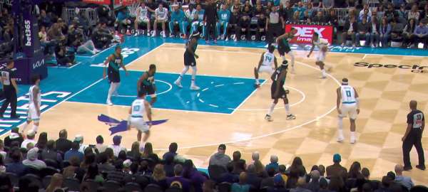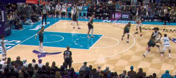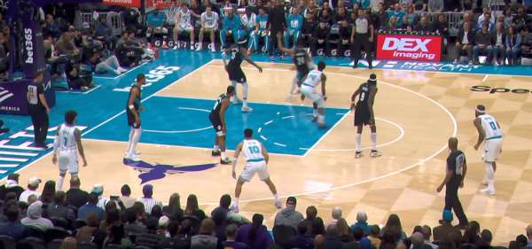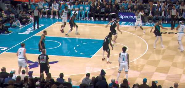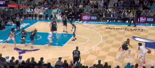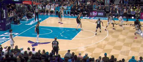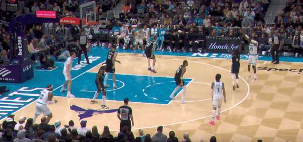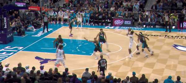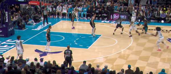 黄蜂阵地战的L跑位:米勒从底角启动,借怀特和迪亚巴特掩护绕至弧顶接球,随后和迪亚巴特掩护发起,利用克林根的沉退出手三分: