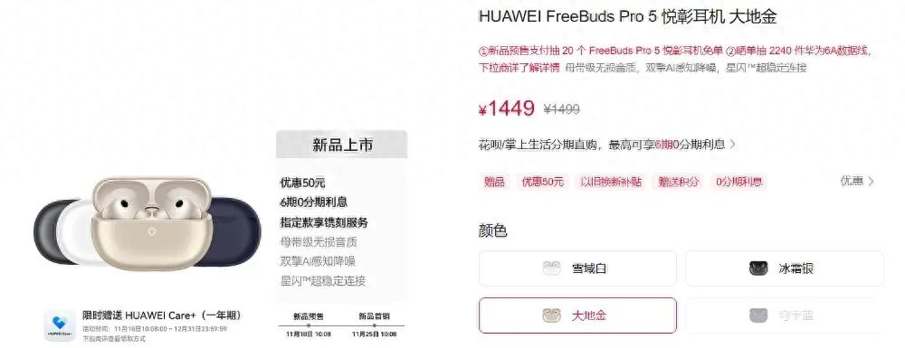 今日,华为 FreeBuds Pro 5 悦彰耳机开启预售,建议零售价1499 元,到手价 1449元,将于11月25日10:08 开启首销。