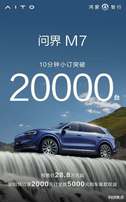 华为新问界M7刚刚开启预订,就火到爆了!开启预订才10分钟,订单就突破2万台,43分钟直接冲破了10万台大关,官方商城甚至一度被挤崩。连余承东都说,这数据远超预期,可以说是现象级的爆单了。