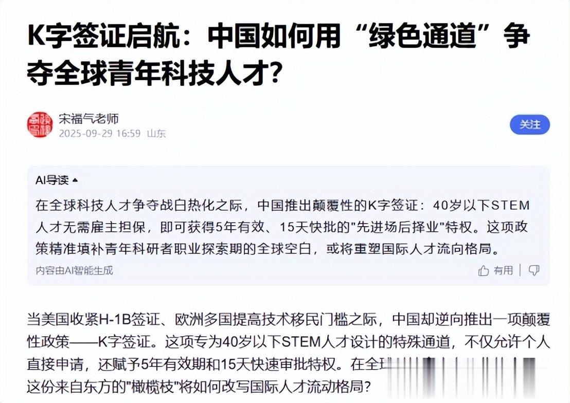 中国目前也像美国一样设立了特别绿色通道,对于全球科技领域的年轻人才,只要有技术甚至不需要担保,就可以直接到中国进行工作创业。