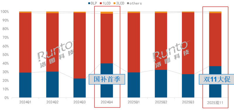 但在“哑铃”的另一端,占据整个投影市场60%以上销量的1LCD赛道,却长期处于“群雄混战”的局面。洛图科技的双11数据揭示了关键转折点:1LCD市场销额前四品牌——大眼橙、小米、哈趣、天猫魔屏,合计份额达到50%。这意味着,这个曾经混乱无序的赛道,终于迎来了洗牌的关键节点。