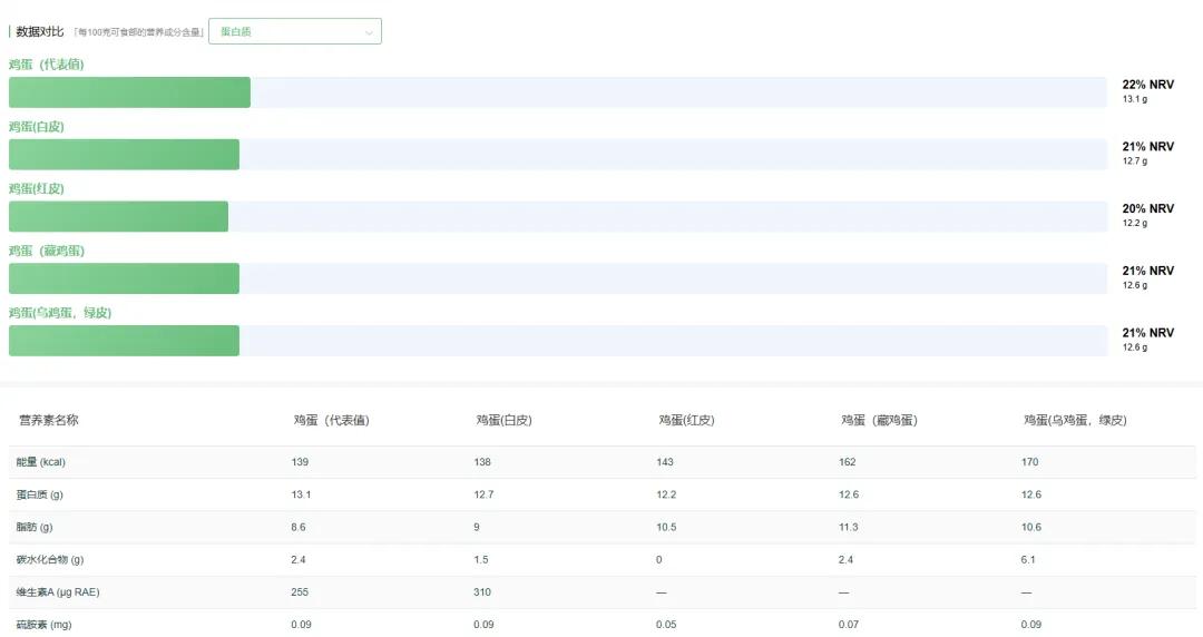 在大营家营养师收录的数据库中对比了常见的几款鸡蛋的核心营养素,经过对比显示,其差异也并不显著。简单来说,选择鸡蛋时,不必为蛋壳颜色多花冤枉钱。