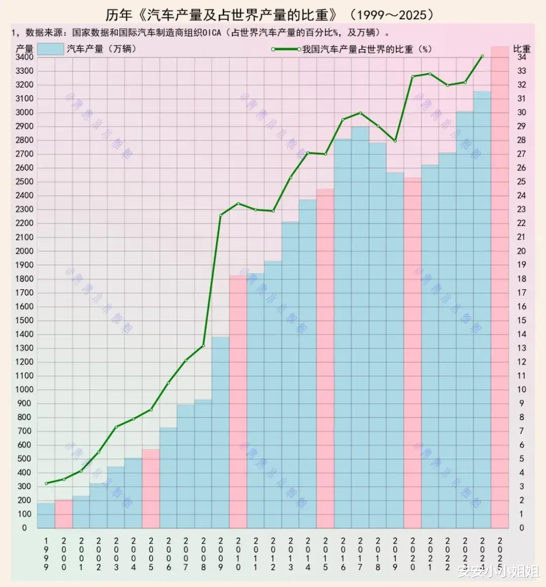到 2025 年,中国汽车产业交出了一份历史性答卷:全年汽车产量突破 3400 万辆,占世界汽车总产量的比重超过 34%,正式迈过 “三分之一” 的门槛。