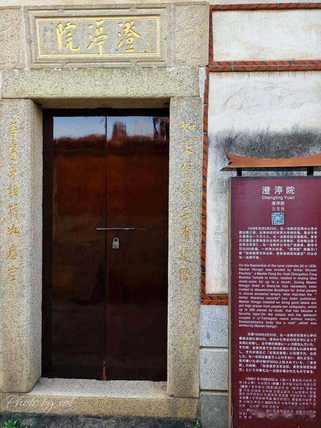 桥头亭一侧,就是后期重建的『澄渟院』。一九三八年农历九月二十日,弘一法师受邀来到安海,住锡水心禅寺的僧房长达一月之久。僧房就在安平桥头。推开门窗,便能望见平静澄澈的水面。法师喜此净舍,遂题名为“澄渟院”。当然,现今的方位和意境,必是不同于往昔了。但门匾『澄渟院』及对联『如来境界无有边际,普贤身相犹如虚空』,均出自法师手笔无疑。