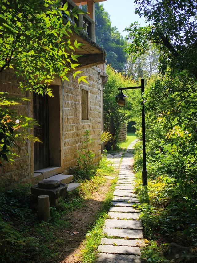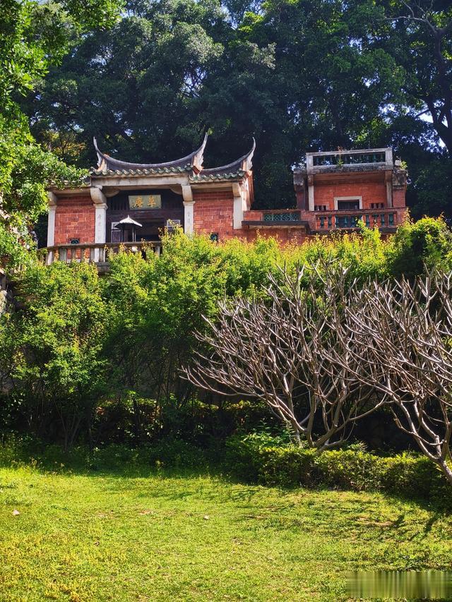 居中是一片碧绿草坪,四周古木参天。古朴精巧的小小寺院,依山崖而建。荫浓绿翠,清幽静谧,好似林间忘忧谷。难怪当年弘一法师第一次来草庵时,就觉得这里是闭关修养的好所在。复又两度来此,一住就是数月,足可见其喜爱之情。