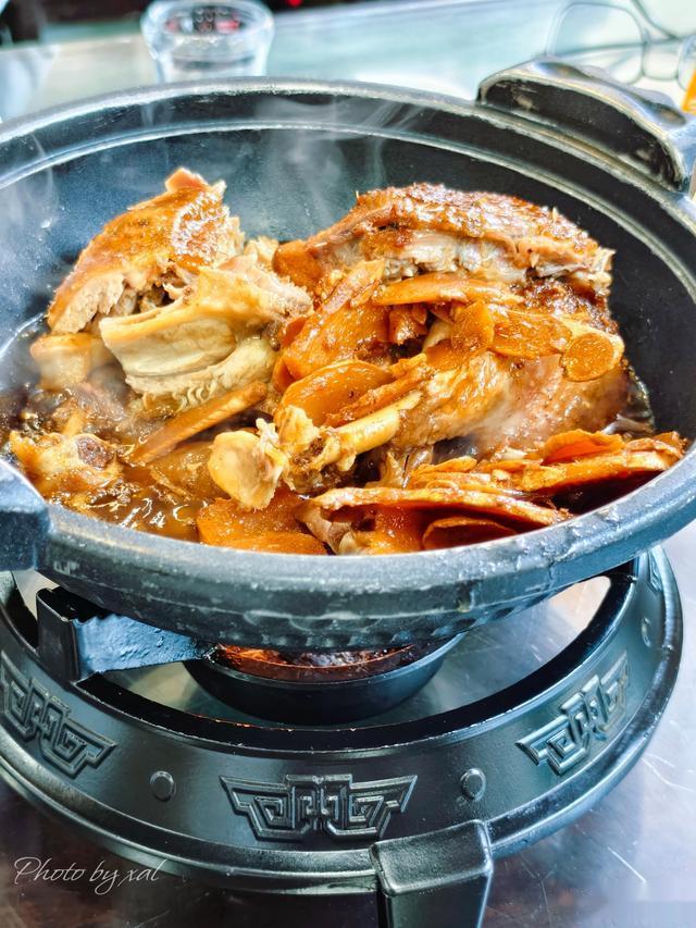 姜母鸭端上来的时候,还用小炉子煨着。热气腾腾,香味扑鼻,颇有几分仪式感。我们郑重其事地各夹一块,细细品尝:鸭肉酥烂嫩滑,轻松脱骨。浓郁的老姜,有效地祛除了鸭肉的腥气,也更好地激发了肉质的鲜甜,油而不腻,风味绵长。
