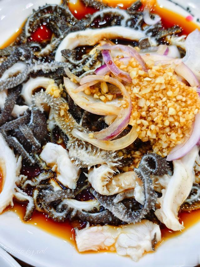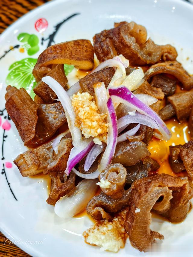 第一次吃“拌”的牛百叶、牛蹄筋,而且是“热拌”不是凉的。食材的口感比凉食偏软一点,但与蒜泥、洋葱、酱料混合之后,却另有一番风味!