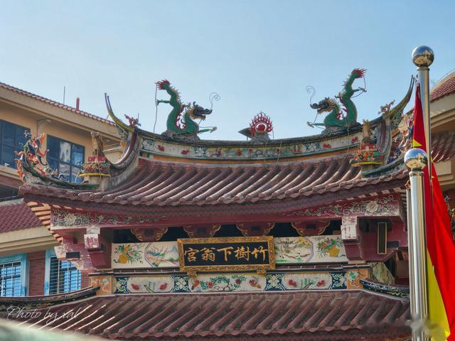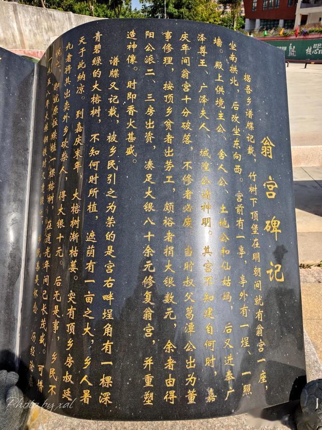 竹树下翁宫在石泉路西头。这是典型的闽南建筑,红砖主体燕尾脊,顶上还有彩绘和雕饰,阳光下看过去,十分抢眼。宫门前立有“翁宫碑记”,形似一本打开的书卷。大意是说,此地明朝时就有翁宫一座,至嘉庆年间破败,于是乡人一齐出资出力重修,后香火甚盛云云。