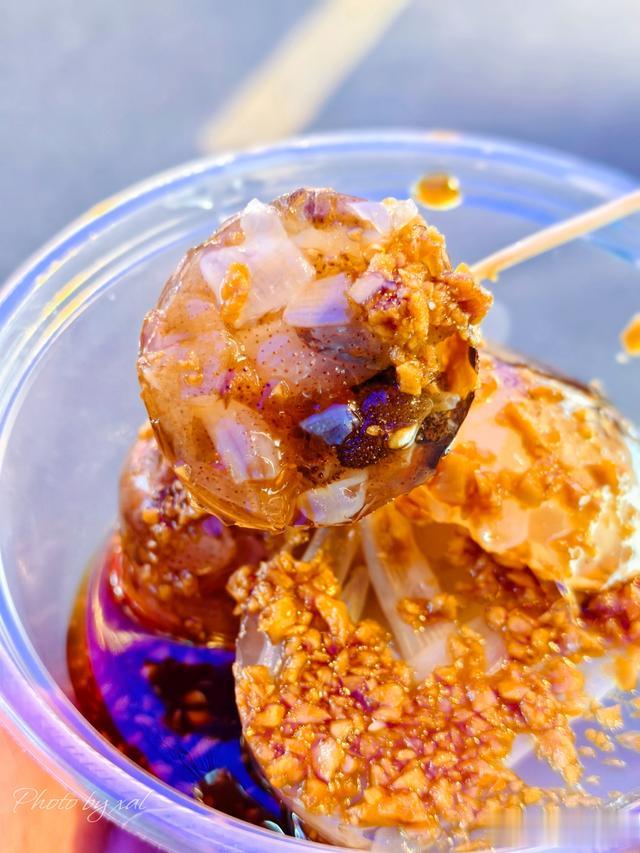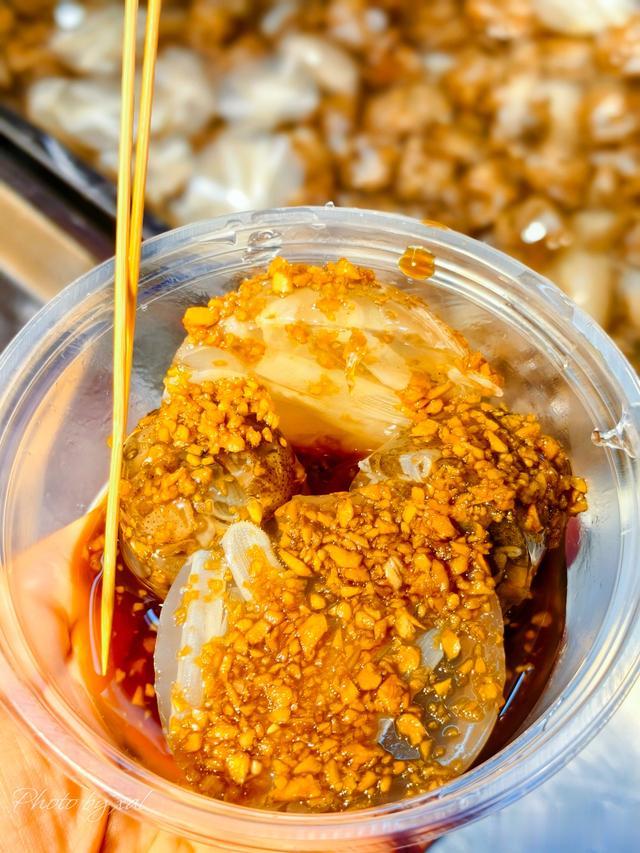 一路走过去,见过的没见过的各种小吃,如繁花入眼,一时不知从何选择!品尝了地方特产“拳头母”,一种手工制作的猪肉丸,不是常见的圆形,规格也大了很多,有弹性,嚼劲十足。