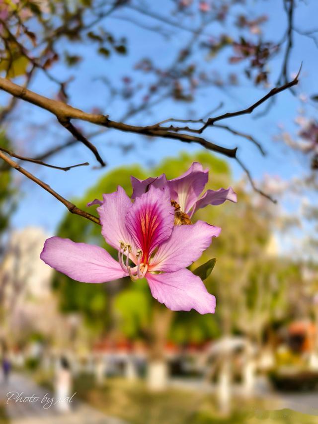 安平桥公园,是一座综合性的开放式文化公园。这里有桥,有寺,有塔。有湖,有湿地,有树林。环境好,景色美。还有一种高挺的秀木,开着一朵一朵紫红色的花,非常漂亮。看树干上的铭牌,才知是“宫粉紫荆”,一种寓意和睦兴旺、生长在热带和亚热带地区的花。